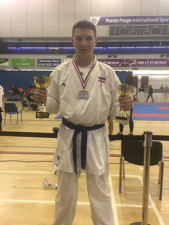Later in the afternoon, the kumite bouts began with Cody fighting, progressing through the first round only to just miss out on progressing to the second round after putting on a brilliant kumite performance. Henry had a tough afternoon as he had three events ahead of him with his team event coming first where they managed a silver medal. Henry then fought in his weight category (70kg+) and once again for the second time in the day managed to make it to the final and gained a hard-earned silver medal fighting one of the top world ranked competitors. Henry saved the best for last and managed to come away with the English National title for the Open Weight category after some brilliant shots.
